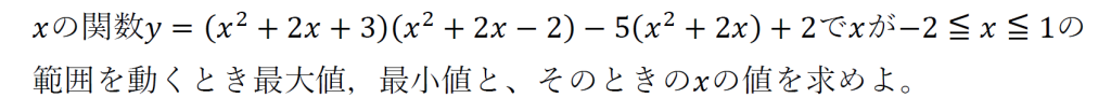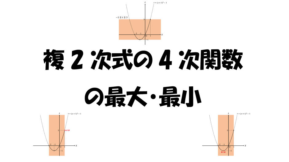 \(x^4\)と\(x^2\)と定数項のみからなる4次式を複2次式と呼ぶ。「\(x^4\)」とか「\(x^4+2x^2\)」とか「\(x^4-4x^2+4\)」とかとか。複2次式は\(x^2=t\)と置くことで「\(x^4=t^2\)」とか「\(x^4+2x^2=t^2+2t\)」とか「\(x^4-4x^2+4=t^2-4t+4\)」という感じに「\(t\)の2次式」とすることができる。4次関数の最大・最小は微分法を使う数学Ⅲの範囲だけど、複2次式であれば数学Ⅰの範囲でも解くことができる