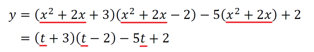 まずは\((x^2+2x+3)(x^2+2x-2)-5(x^2+2x)+2\)で\(x^2+2x\)という式が共通していることを見つける。