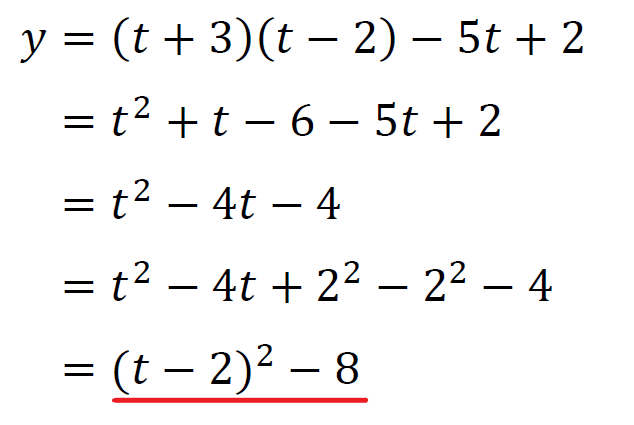 \(y=(t+3)(t-2)-5t+2\)を展開して平方式に平方完成する。