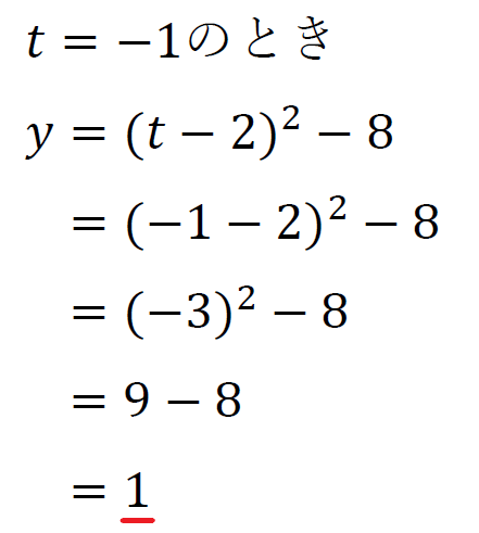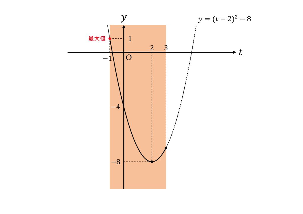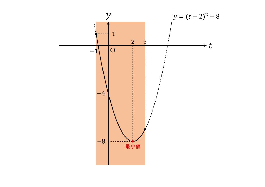 頂点\((2,-8)\)は\(-1≦t≦3\)内にあるので\(t=3\)で最小値\(-8\)をとる。