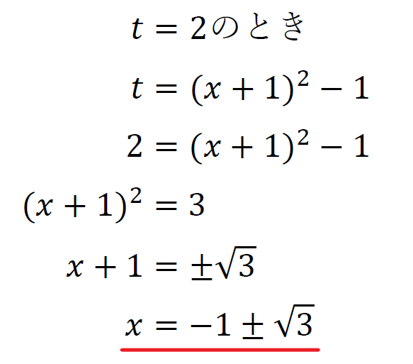 最後に置き換えた\(t\)から\(x\)の値を求めるを忘れずに。