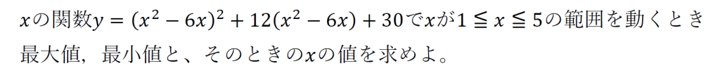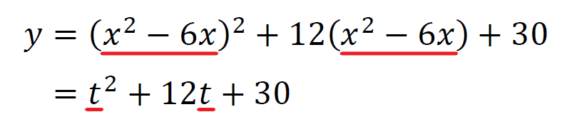 まずは\((x^2-6x)^2+12(x^2-6x)+30\)で\(x^2-6x\)という式が共通していることを見つける。