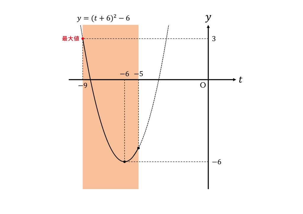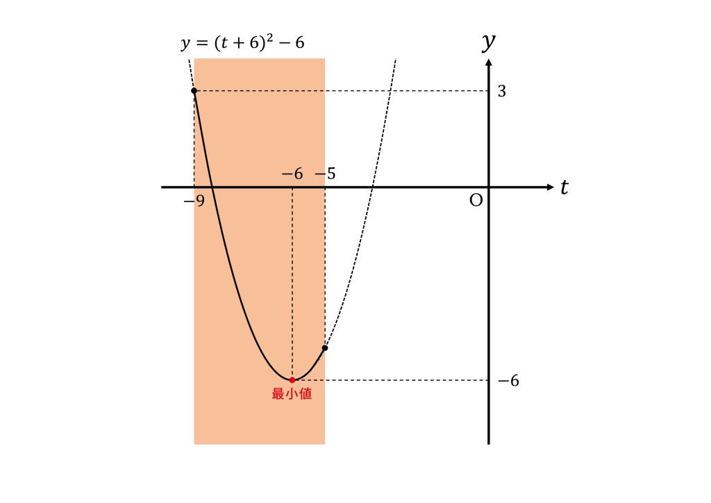 頂点\((-6,-6)\)は\(-9≦t≦-5\)内にあるので\(t=-6\)で最小値\(-6\)をとる。