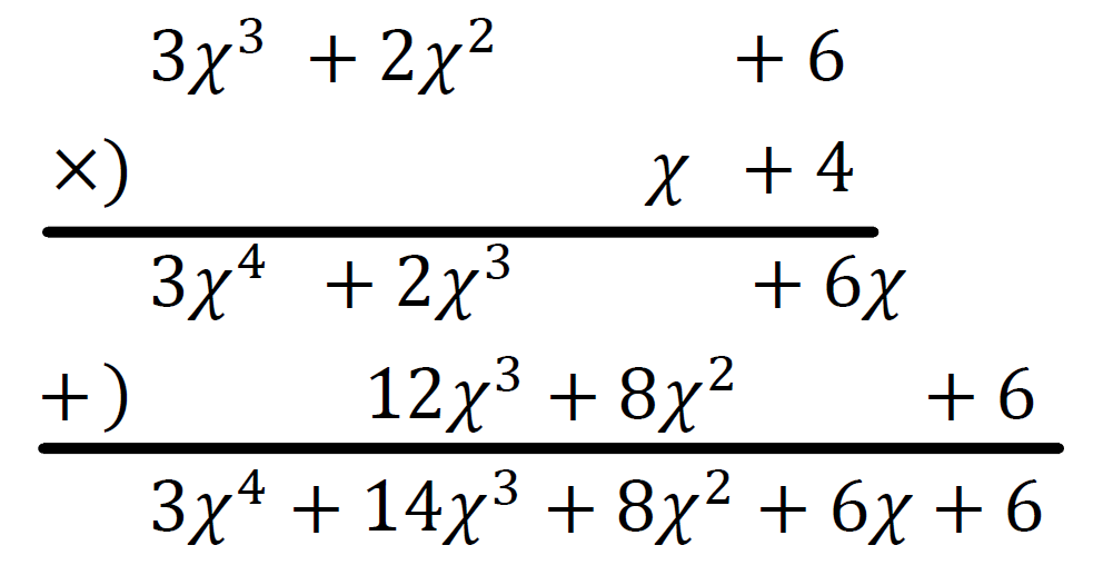 今度は「乗法」について、実際に(多項式)×(多項式)を「縦書き」で計算してみる。