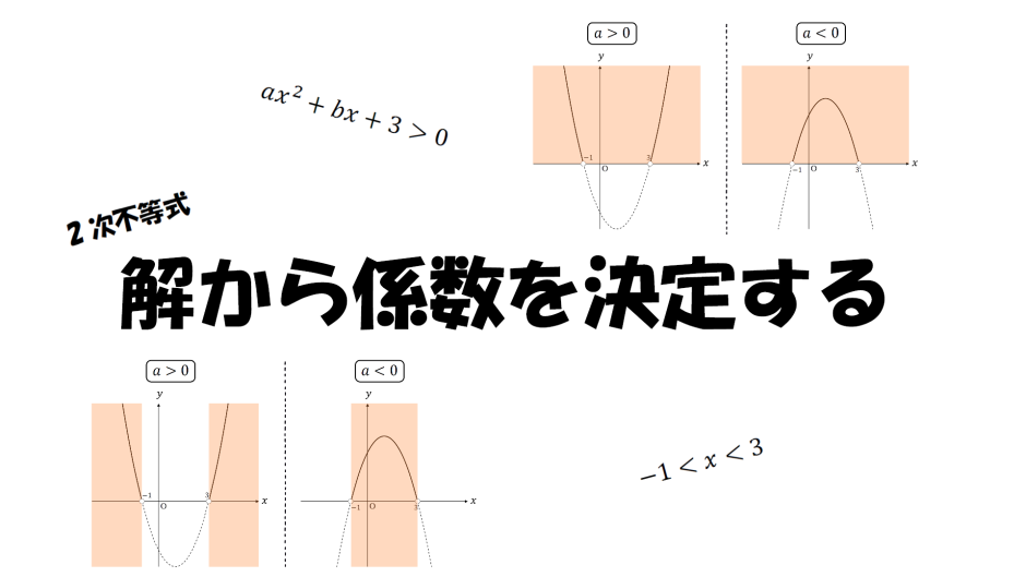 例えば、2次不等式\(ax^2+bx+3\)>\(0\)の解が\(-1\)<\(x\)<\(3\)となるとき、定数\(a,b\)の値を定めることを「解から係数を決定する」という。