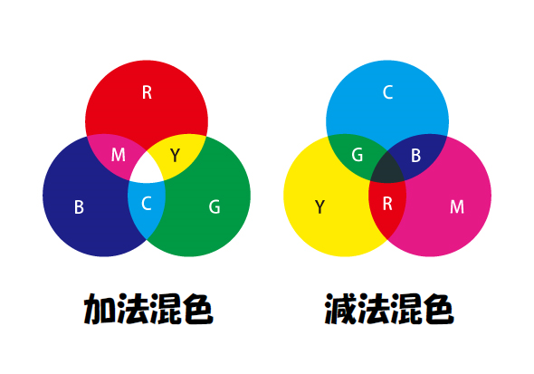 加法混色では「Red・Green・Blue」を光の三原色とし、これらを混ぜ合わせると光エネルギーが加算されて色が明るくなっていく。